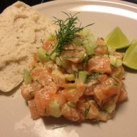Ingrédients (pour 4 personnes) : 500 g Saumon de Norvège sans peau ni arêtes 1/2 Concombre 1 cuillère à soupe de Moutarde forte 1 cuillère à soupe d’Aneth finement haché 1 pincée de Sel 4 Tranches de baguette 1 Citron Préparation : Coupez le Saumon de Norvège en tout petits dés. Épluchez Read More ...