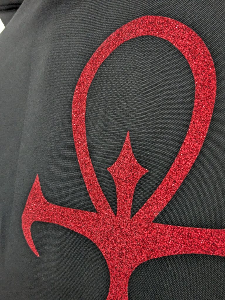 Puis, j’ai fait le reste de la cape : noir à l’extérieur et rouge à l’intérieur. Et, ça m’a rappelée énormement de souvenirs car je jouais au jeu de rôle « Vampire : la Mascarade » où j’étais une jolie grande blonde avec les yeux bleus du clan Toréadors, un des Clans fondateurs de la Camarilla ! (Dans la première édition, il n’avait que 7 clans et une seule secte, la Camarilla. La deuxième édition s’agissait la seconde secte, le Sabbat, commence à y être décrit, ainsi que les luttes d’influence. À l’époque où je jouais, c’était la troisième édition qui pourrait être considérée comme l’édition de la maturité. Elle met l’accent sur la lutte politique mondiale se déroulant principalement entre Camarilla et Sabbat mais impliquant les 13 clans, pour y planter une fin du monde.) Donc, il fallait obligatoirement faire un signe de la Mascarade sur la cape … que j’ai fait avec ma cricut : en 2 temps, 3 mouvements, c’était plié ! Et, forcément en rouge puisque l’intérieur est rouge. (Bon, je n’avais que rouge pailleté donc ça a fait l’affaire hein !)